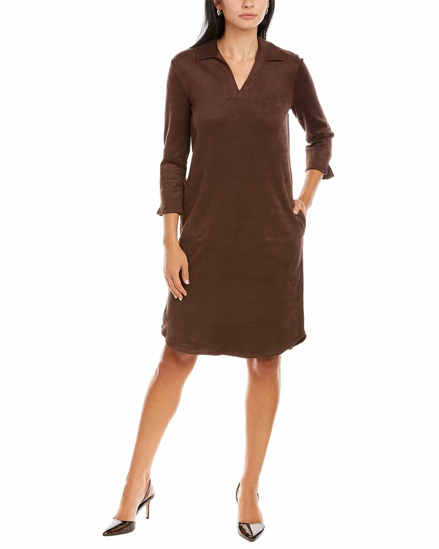 - Caelin Dress in mocha with spread collar, V-neck, 3/4-length sleeves, dual side on-seam pockets, and curved hem