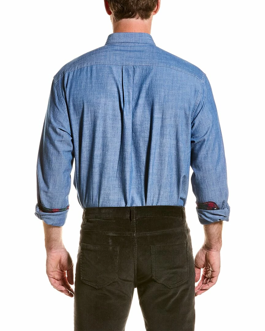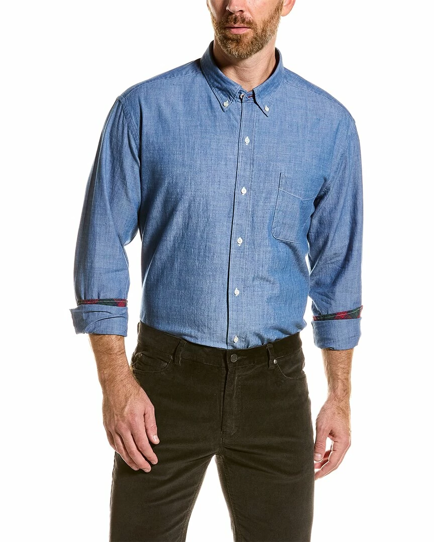 - Carnegie Shirt in chambray with button-down collar, left chest pocket, and button cuffs