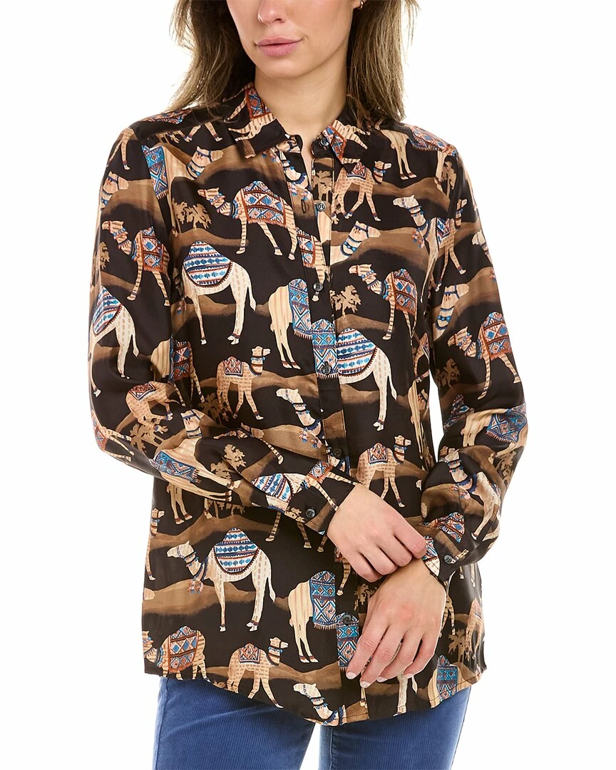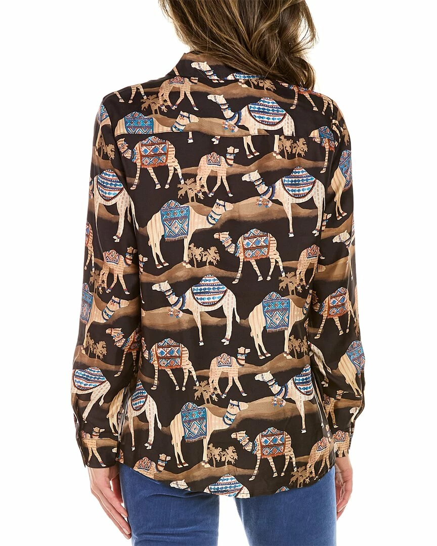 - Darcey Silk-Blend Blouse in brown & multicolor with spread collar and button cuffs