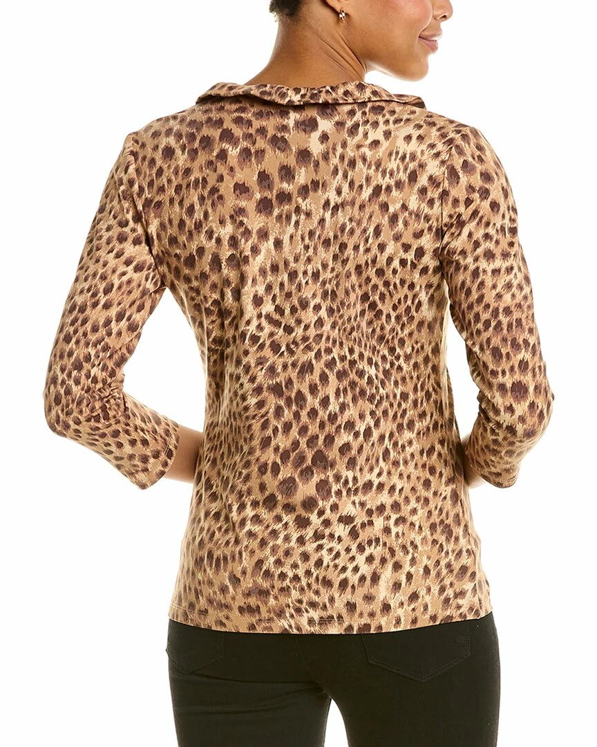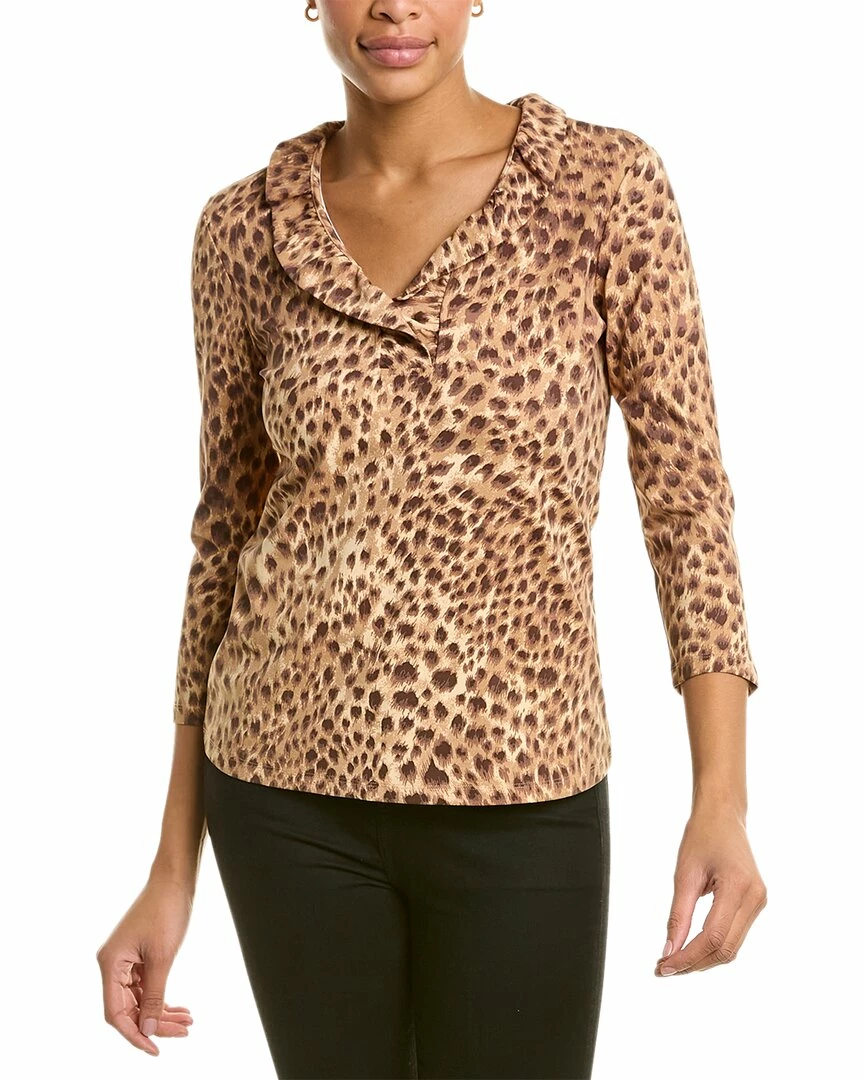 - Durham Catalina Cloth Top in camel & brown safari with ruffle-trim V-neck and 3/4-length sleeves