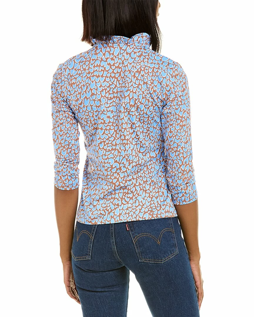 - Durham Catalina Cloth Top in cocoa brown & sky blue jungle dot with ruffle-trim V-neck and 3/4-length sleeves