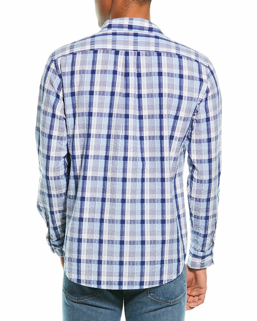 - Gramercy Woven Shirt in white & blue & navy with spread collar, left chest pocket, and button cuffs