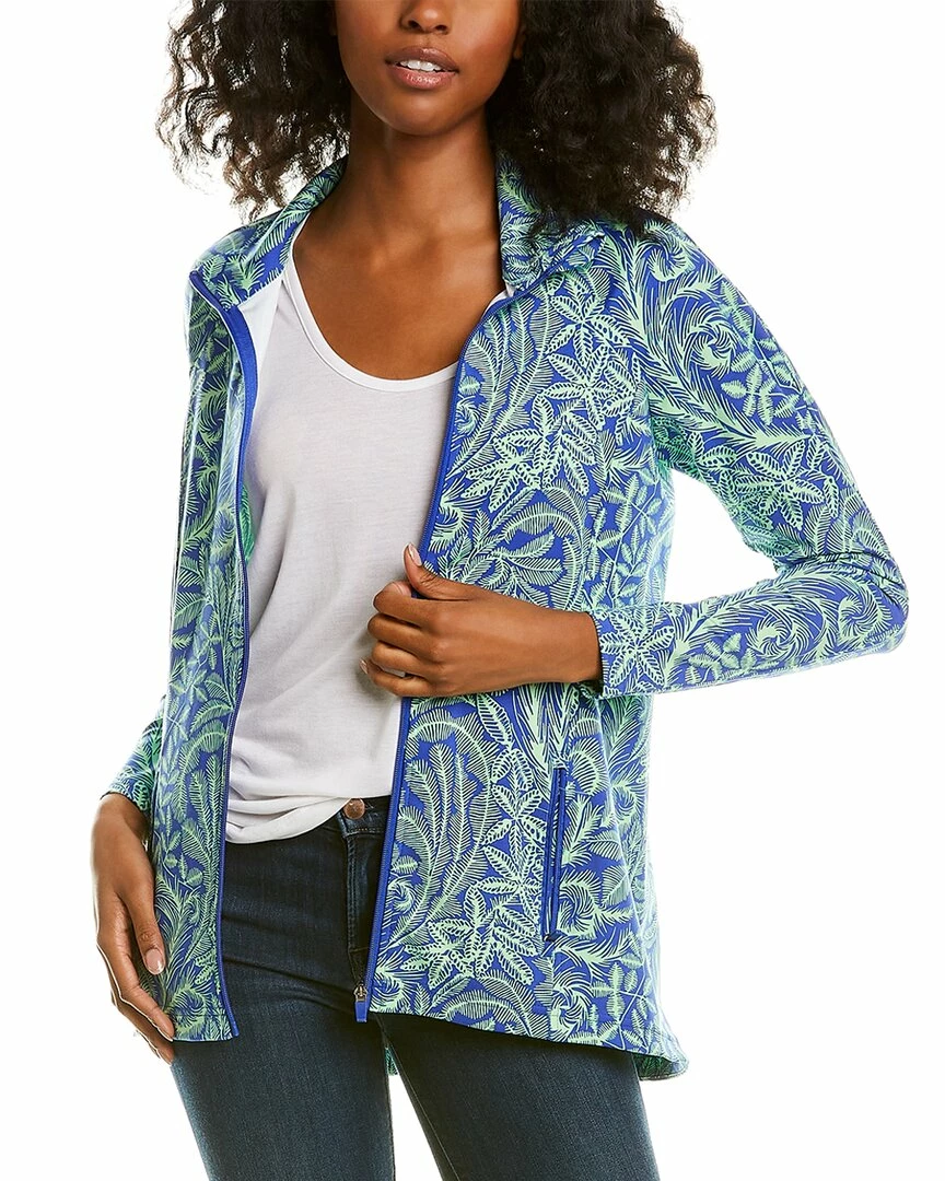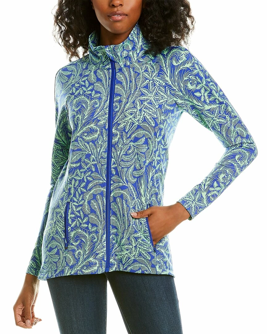 - Kelsey Jacket in marine blue and green with stand-up collar, two zippered front pockets, and high-low hem