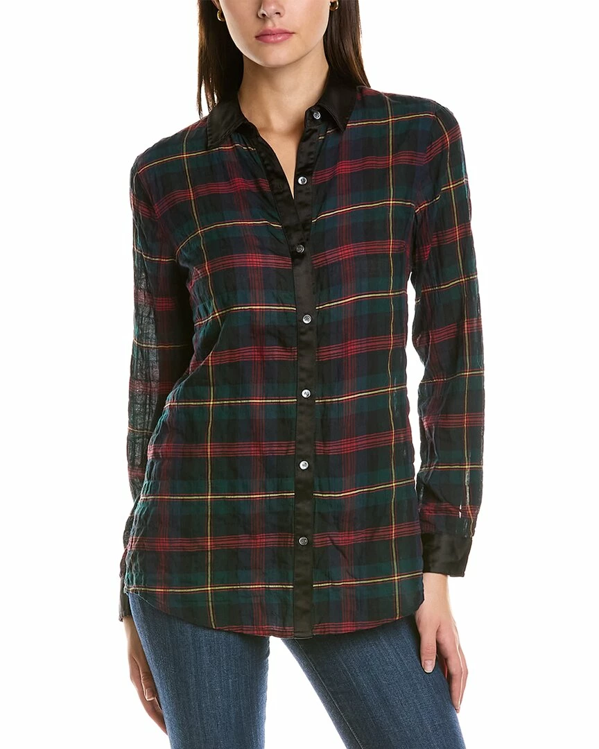 - Leal Blouse in green & navy & red with spread collar and button cuffs