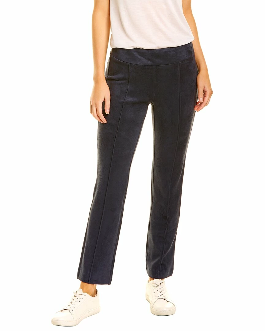 - Rylie Pant in navy with faux suede design, elasticized waist, pintuck accents, and dual back pockets
